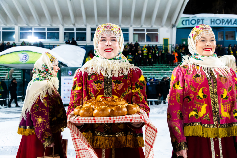 Передача эстафеты состоялась перед матчем «Водника» и ульяновской «Волги». Под песни из нового альбома Северного хора «Песни Северной Двины» артисты поприветствовали спортсменов и зрителей на трибунах.