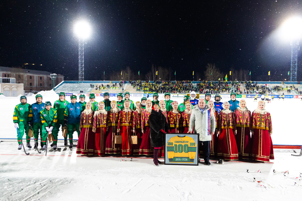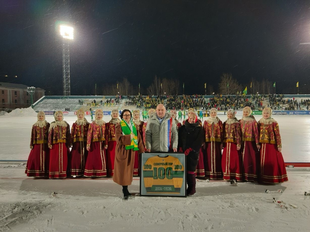 Представители Северного хора преподнесли хоккеистам «Водника» сувениры с логотипом коллектива, а гостям из Ульяновска – каравай. Директор команды «Водник» Роман Клобуков, в свою очередь, вручил директору Северного хора Наталье Асадчик игровую футболку с символическим номером 100.